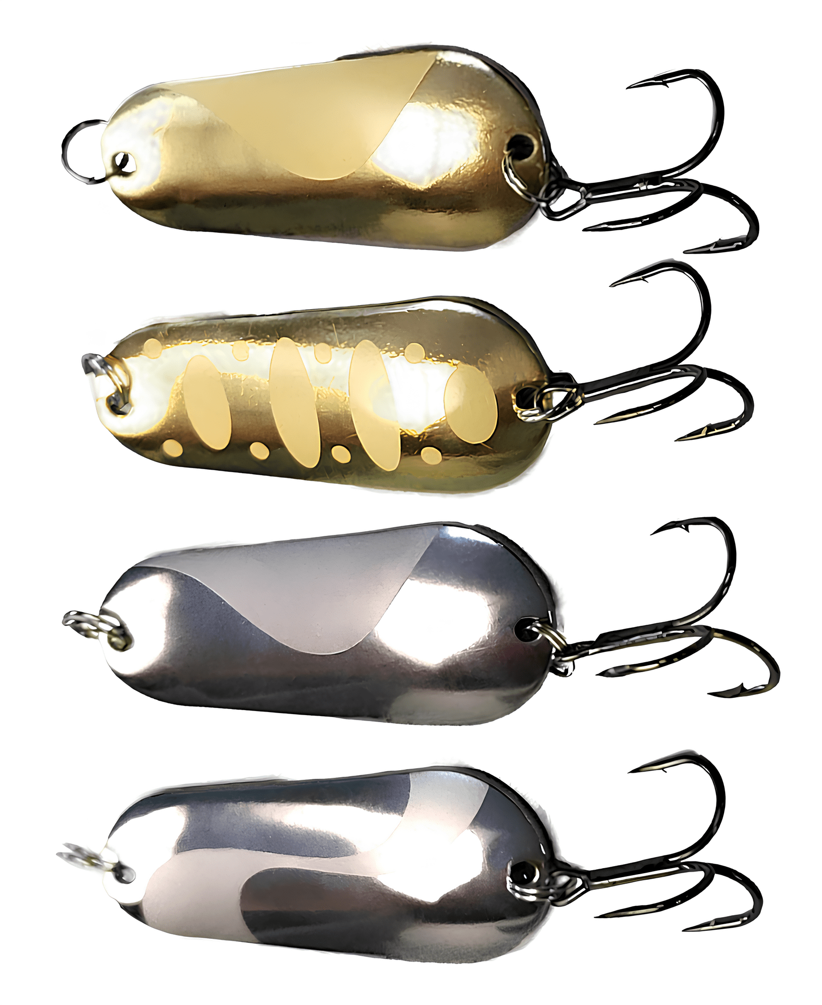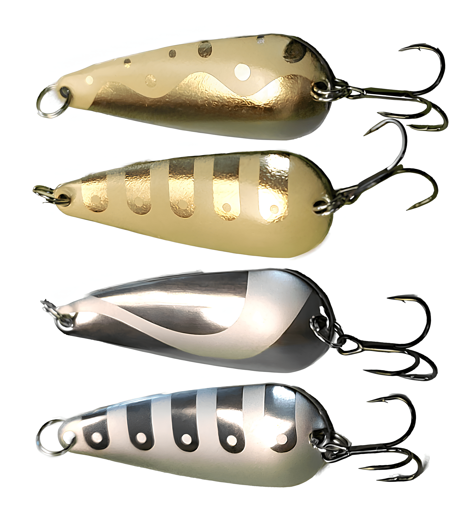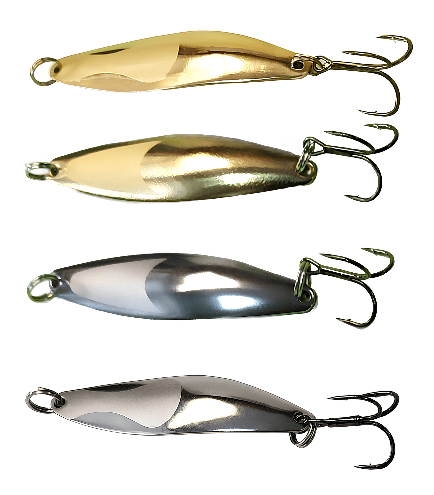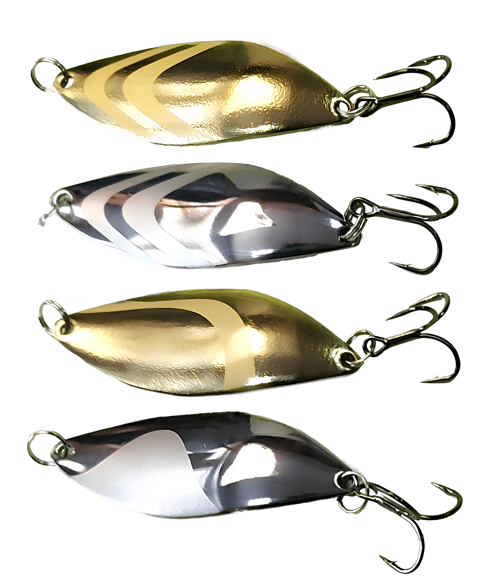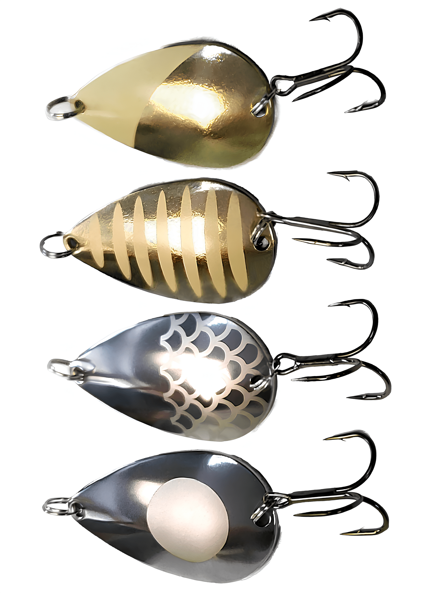•  Плоские (классические) блесны. Изготавливаются из листового металла толщиной от 0,5 до 3,0 мм методом штамповки. Чем глубже штамповка, тем более стабильной становится игра блесны, хотя и менее активной по амплитуде. Плоские блесны легко играют, но они более склонны к срыву во вращение. Однако, игра во многом зависит от изгибов блесны. Чем больше продольных изгибов, тем устойчивее и активнее игра. Иногда даже небольшое различие в геометрии блесны существенно влияет на количество поклёвок. Выбор таких блесен индивидуален и зависит от предпочтений хищника в данный момент времени.