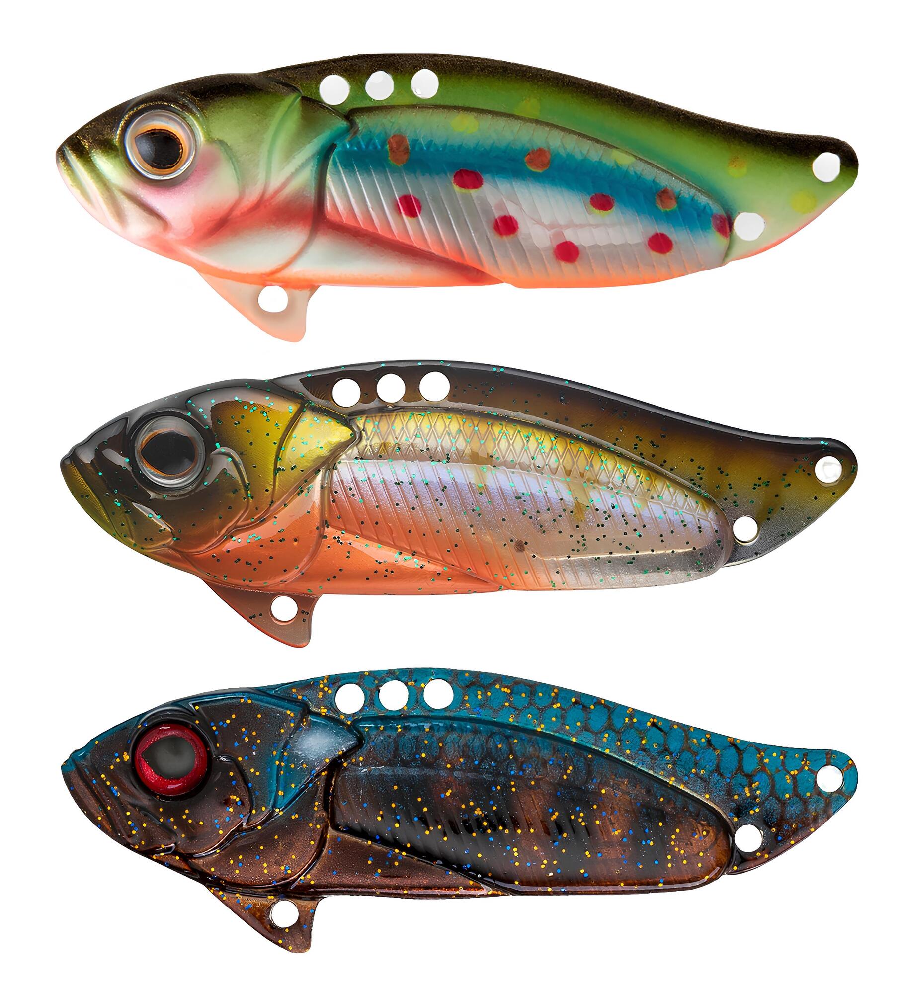 •  Лёгкие — до 10 грамм. Такие блесны обладают небольшой дальностью заброса и предназначены для медленной проводки в верхних слоях водоёмов. Лёгкие тонкостенные блесны медленно тонут и обладают ярко выраженной игрой. Они активно используются в холодную погоду и даже при ловле троллингом.